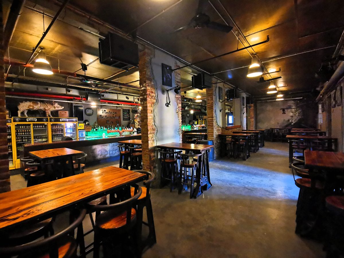 Naziv Vintage Industrial u skladu je s njegovim interijerom; prostor je moderno projektiran i opremljen, razdijeljen u tri dijela (šankerski, intimniji, klupsko/koncertni), a uređen je u industrijsko-tvorničkom stilu.